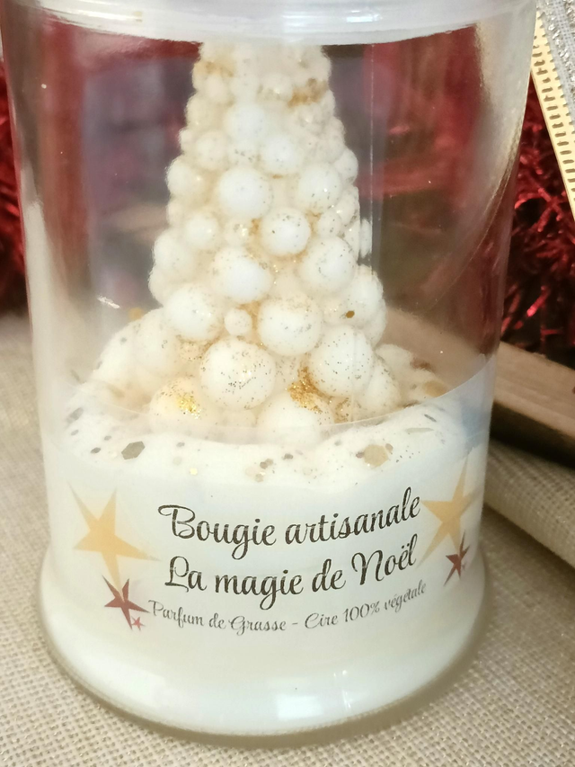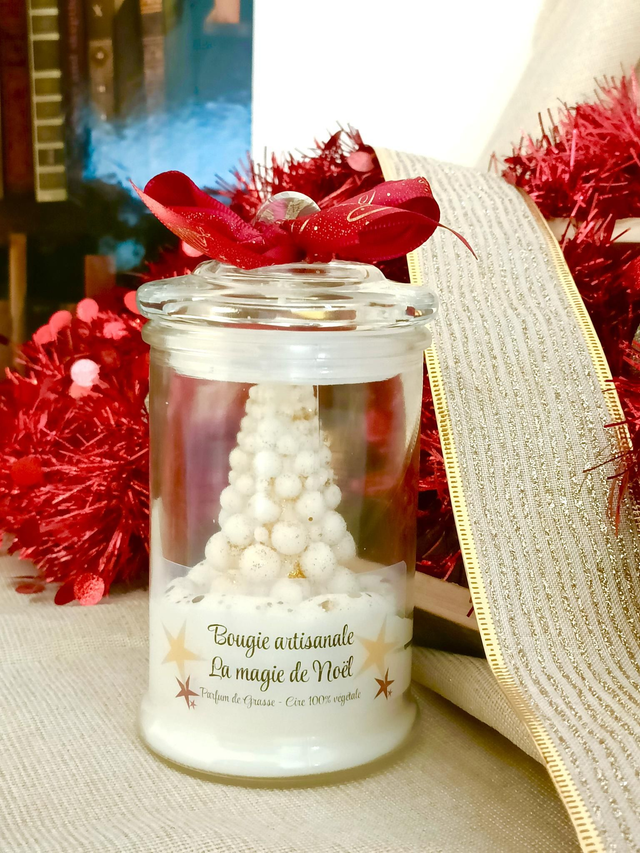 Bougie de Noël coulée dans une bonbonnière en verre avec bouchon, parfum "la magie de Noël", décor sapin design en cire moulée dans une chantilly de cire effet neige. Dimensions 15 cm x 8 cm. Très bel effet déco pour votre table de fêtes.