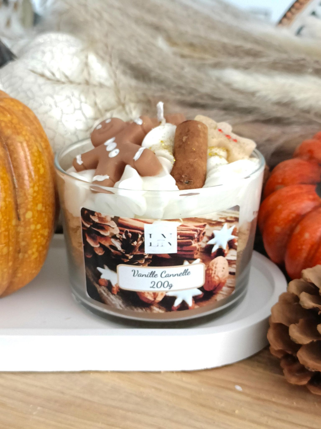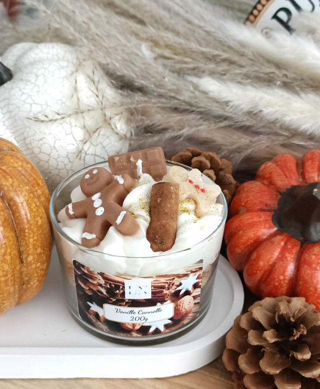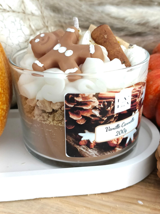Bougie parfumée "vanille cannelle", coulée dans un contenant en verre. Décor gourmand avec chantilly de cire, petit bonhomme pain d'épices moulé, bâton de cannelle. Un parfum qui nous amène doucement vers noël. Fabrication artisanale dans mon petit atelier en Lozère 🏕