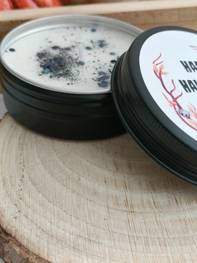Bougie dans une boîte métallique noire, paillettes décoratives. Contenance 60ml. Dimensions 7x3 cm. Trois modèles d'étiquettes disponibles. Non parfumée. Fabrication artisanale dans mon petit atelier en Lozère !
