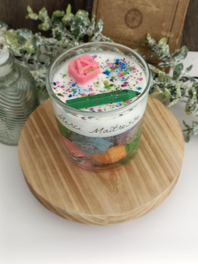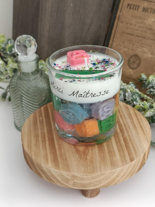Bougie parfumée "monoï" coulée dans un contenant en verre . Décor cubes lettres/chiffres en cire moulée multicolore, base en gel de paraffine effet transparent et dessus en cire de karité. Décor crayon et lettre couleur aléatoire.