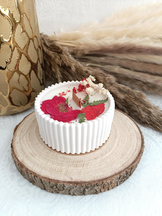 Bougie parfumée esprit nature coulée dans un contenant en résine de plâtre réalisé à la main. Légèrement coloré, le décor en fleurs séchées sera adapté à la couleur du contenant et selon l'inspiration du moment. Une protection en liège est apposée sous le pot pour protéger vos surfaces. 😉Fabrication artisanale dans mon petit atelier en Lozère 🏕