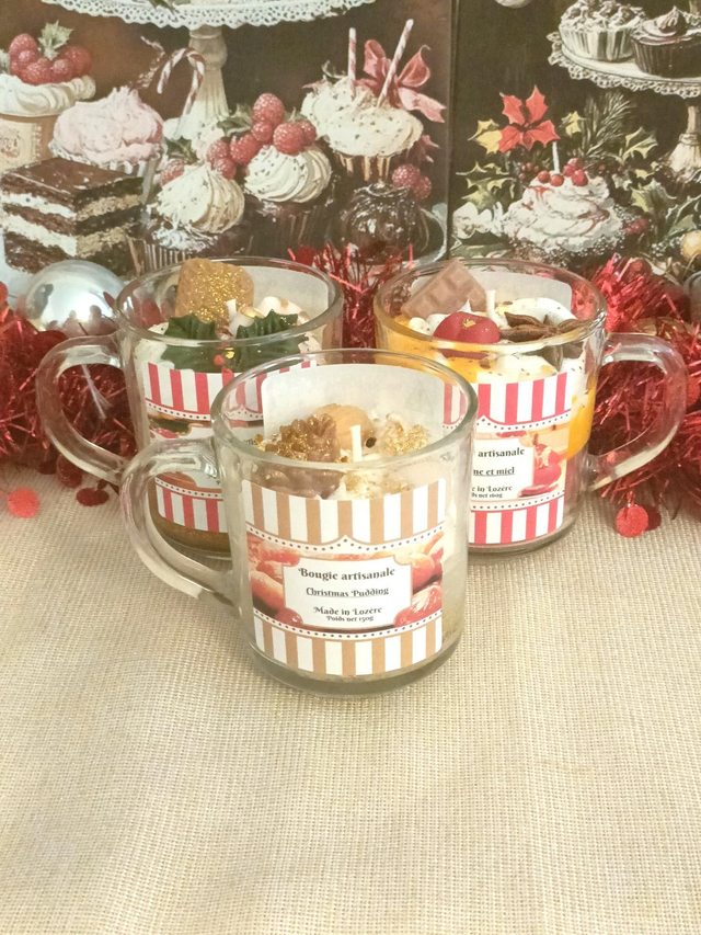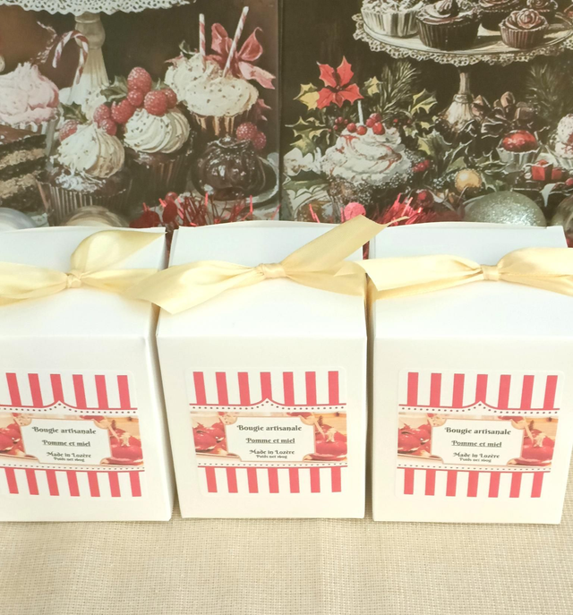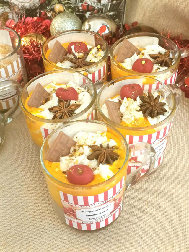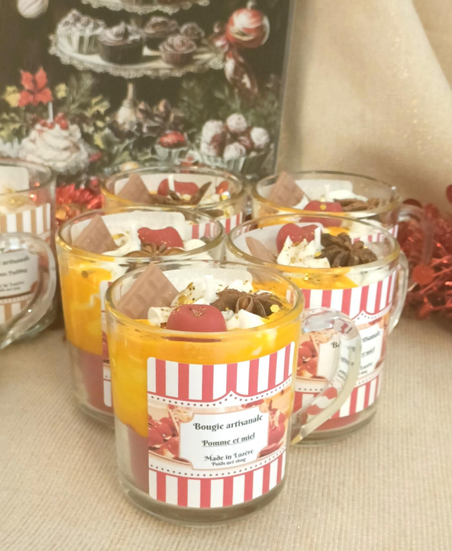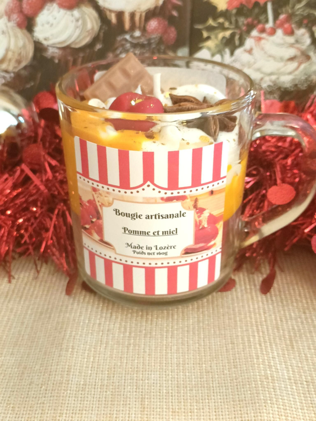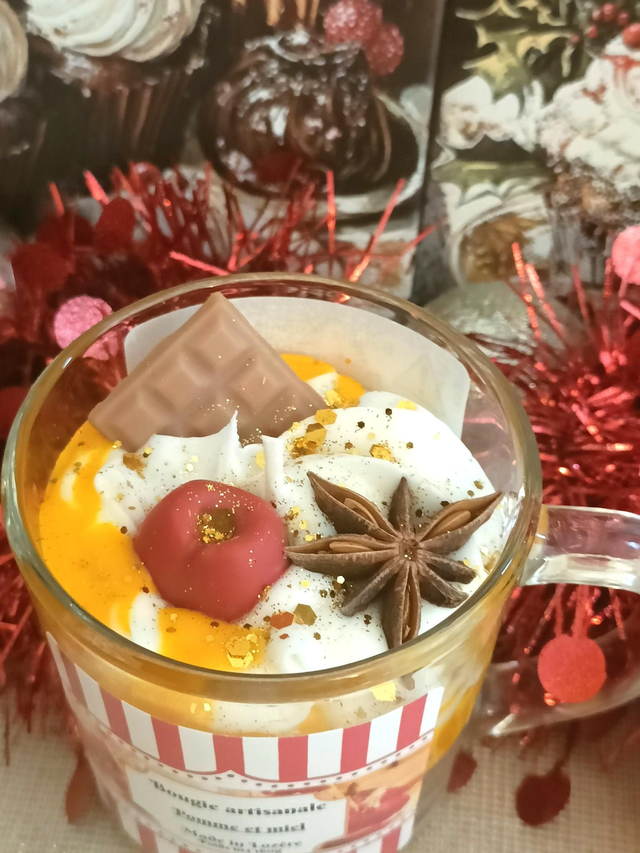 Bougie parfumée unique coulée dans une tasse en verre 20cl. Décor chantilly de cire et moulages en cire. Parfum "pomme et miel". Une bougie effet déco garantie avec un parfum gourmand. Fabrication artisanale dans mon petit atelier en Lozère ! 7cm x 9cm