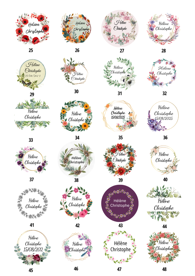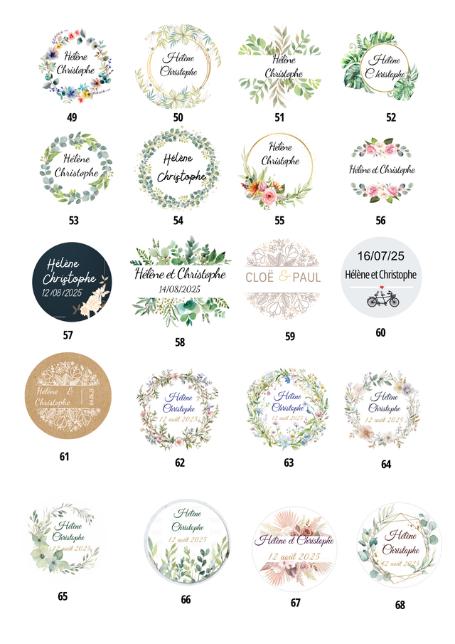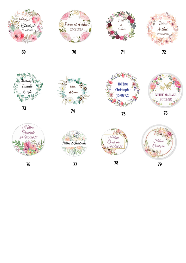 Plaquettes A4 d'étiquettes personnalisées. Plusieurs diamètre disponibles. Imprimées sur papier étiquettes blanc brillant pour un meilleur rendu.