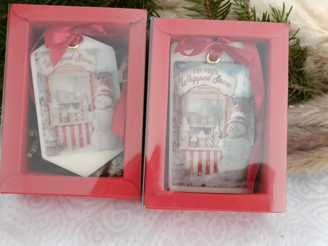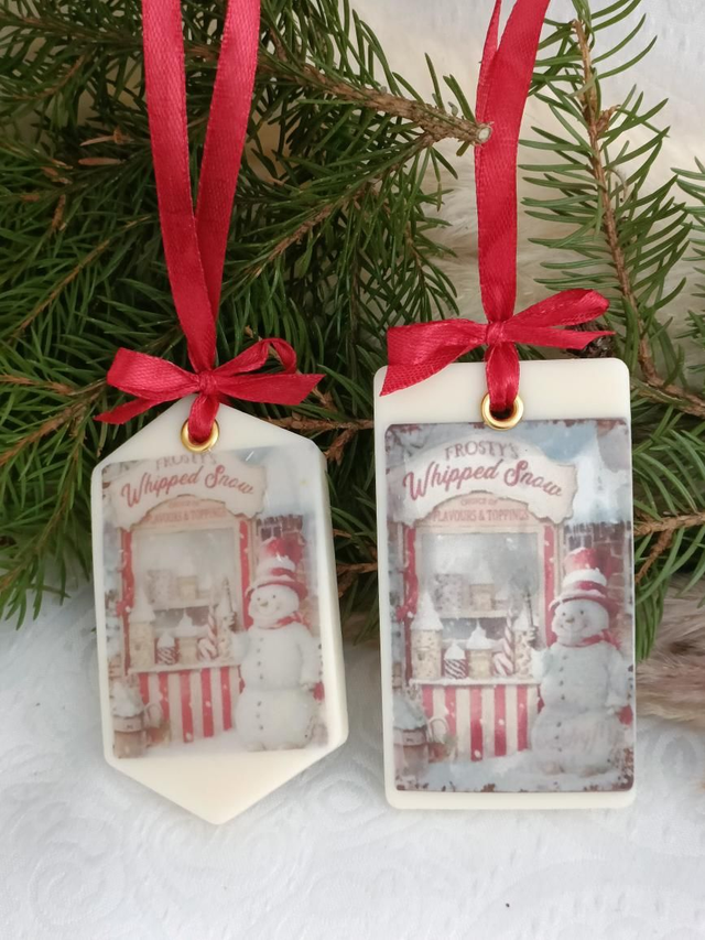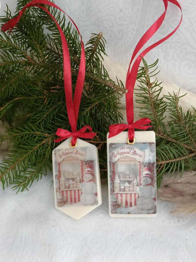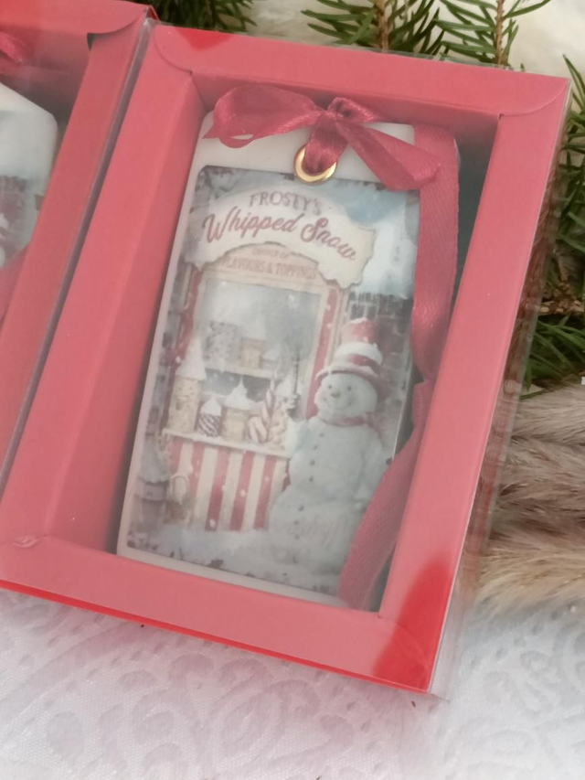 Suspension parfumée de Noël avec incrustation d image. Profitez de la senteur "christmas tree" de cette suspension dans votre sapin, armoires ou tout autre endroit de votre maison. environ 40g. 8cm x 10cm selon la forme