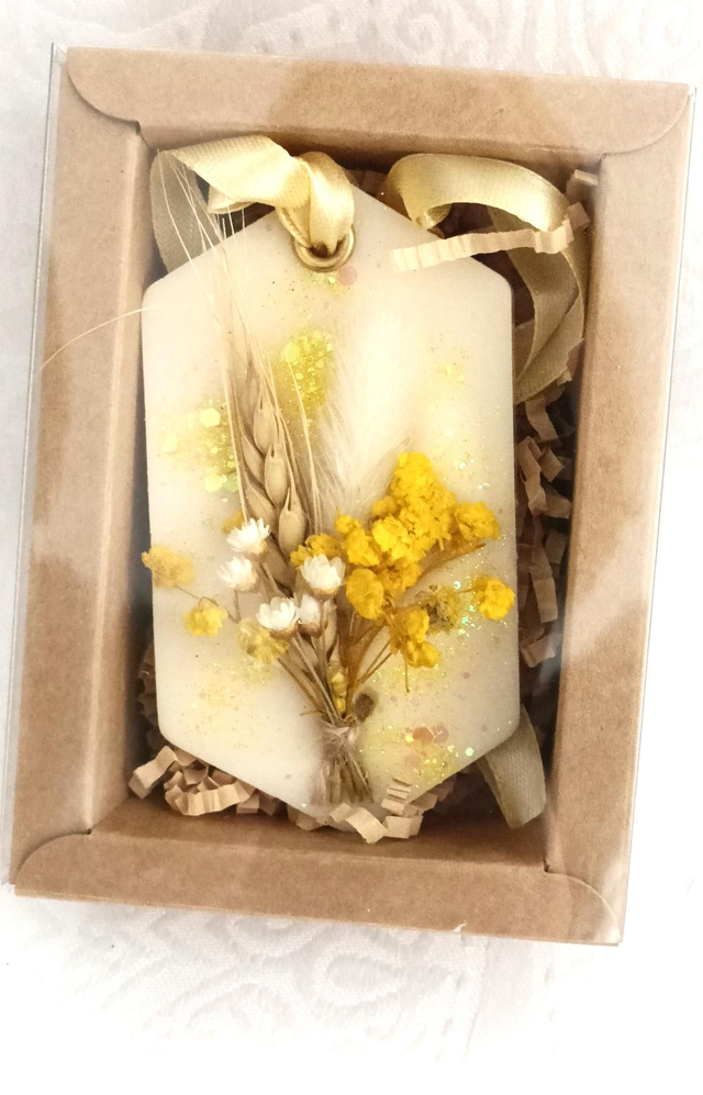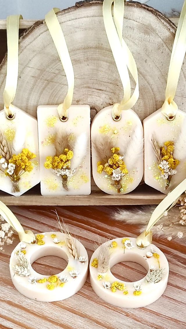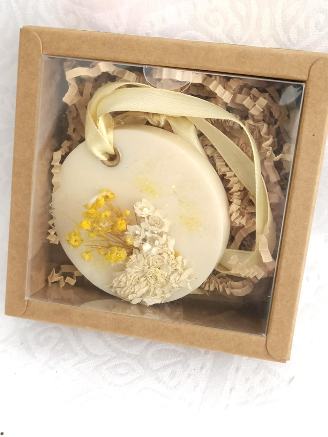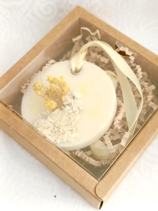 Suspension parfumée et fleurie minutieusement à la main avec de délicates petites fleurs séchées. Profites de la senteur de cette suspension dans tes penderies, armoires ou tout autre endroit de ta maison. environ 40g. Dimensions 10cm x 10cm ou 8cm x 10cm