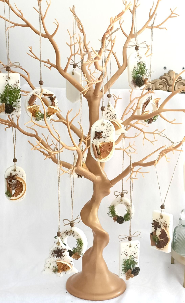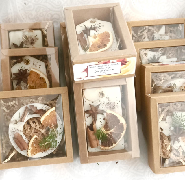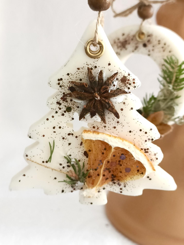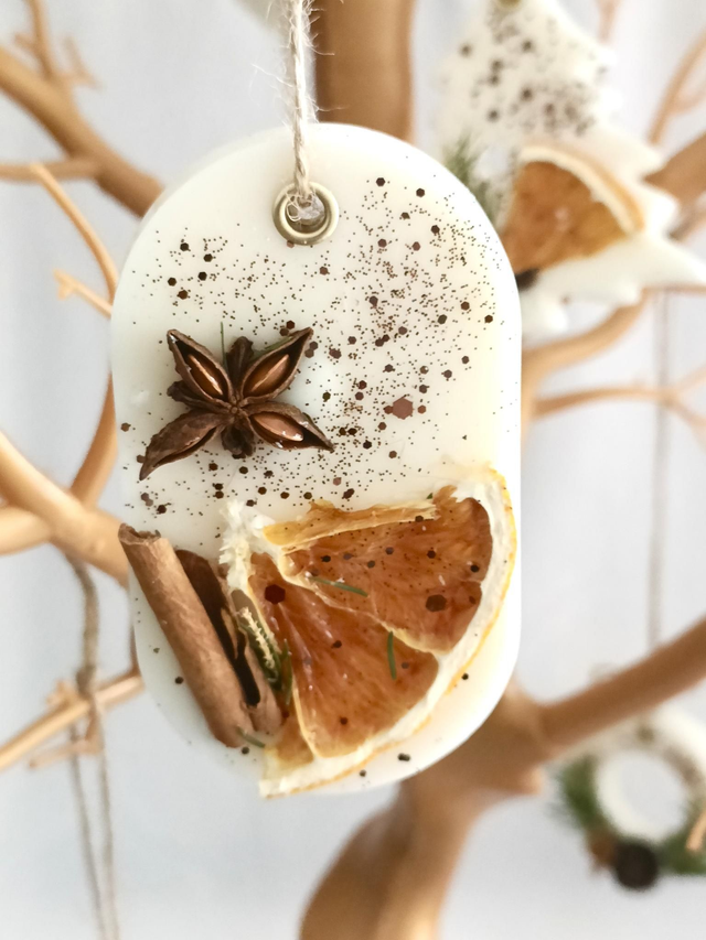 Suspension parfumée décors naturels badiane, bâton de cannelle, orange séchée, branches de sapin. Forme sapin, ronde ou allongée (rectangle, ovale ou hexagonale aléatoire) . Profites de la senteur de cette suspension dans tes penderies, armoires ou tout autre endroit de ta maison. environ 40g. Dimensions 10cm x 10cm ou 8cm x 10cm